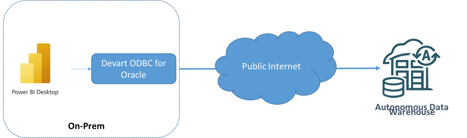 Power BI Desktop uses Devart ODBC for Oracle driver to connect ADW that is hosted in Oracle Cloud, and query data for building analytics.