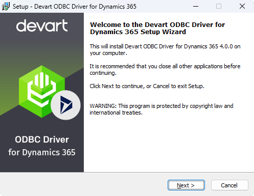Double-click the downloaded installer (e.g., devart_odbc_dynamics365.exe) and follow the on-screen instructions: