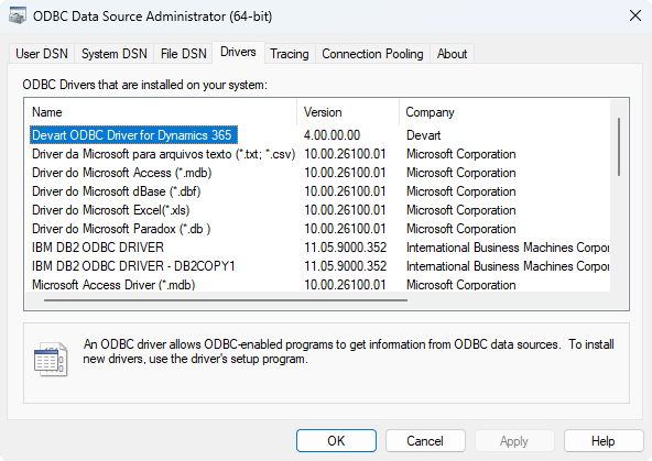 • Go to the Drivers tab and confirm the presence of “Devart ODBC Driver for Dynamics 365.”