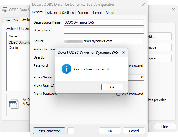 • Click the Test Connection button to ensure Visual Studio can query Dynamics 365 via the ODBC driver.