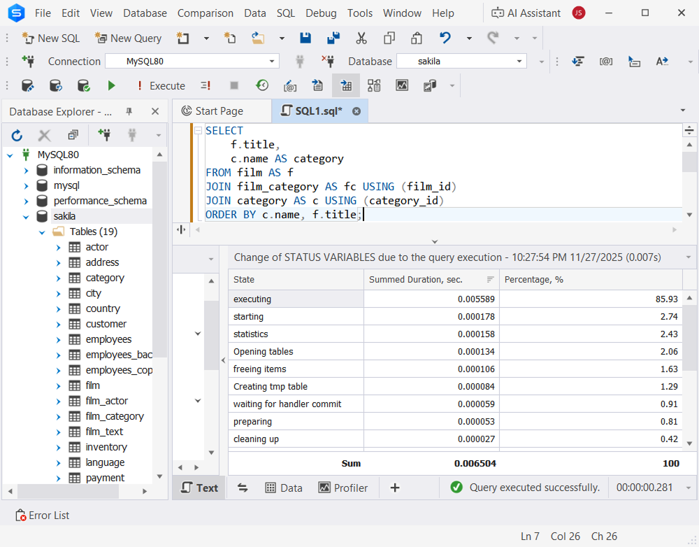 The dbForge Studio for MySQL also allows you to gain deep insights into your query performance using visual execution plans and detailed profiling metrics. This feature helps you to quickly identify bottlenecks, compare results across different versions, and fine-tune performance for faster and more efficient query execution.