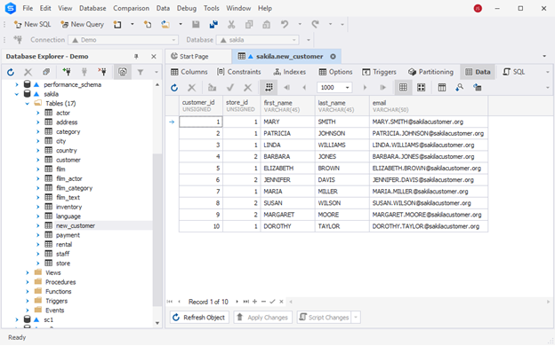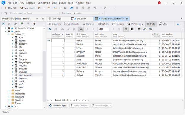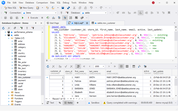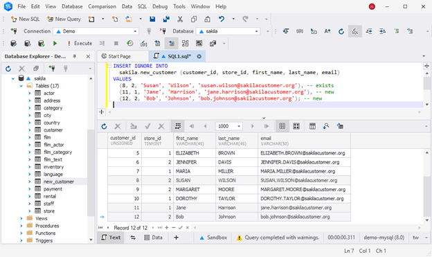 The first record with customer_id 8 already exists in the table. Other records with unique customer_id values are new entries. The query will attempt to insert all records, but the first record already exists in the table. By using INSERT IGNORE, we instruct the system to ignore that record and continue inserting new records. As you can see, it only added two new records. Also, the dbForge Studio for MySQL notified us about warnings.