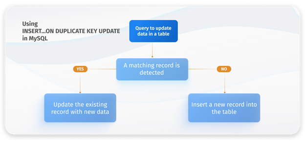 MySQL provides the INSERT … ON DUPLICATE KEY UPDATE statement as a non-destructive alternative that inserts new entries without removing already present and matching records. When it identifies an existing record that matches the UNIQUE or PRIMARY KEY value, this method initiates an UPDATE operation on that already present record. Thus, INSERT ON DUPLICATE KEY UPDATE functions as an effective UPSERT operation.