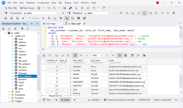 In the following example, we want to update multiple customers in the new_customer table by changing some details for existing customers (active or non-active status) and adding new customers.