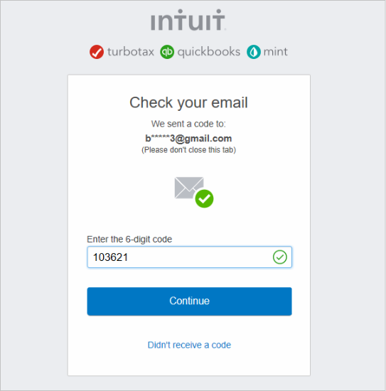 - Enter the verification code sent by QuickBooks and click Continue.