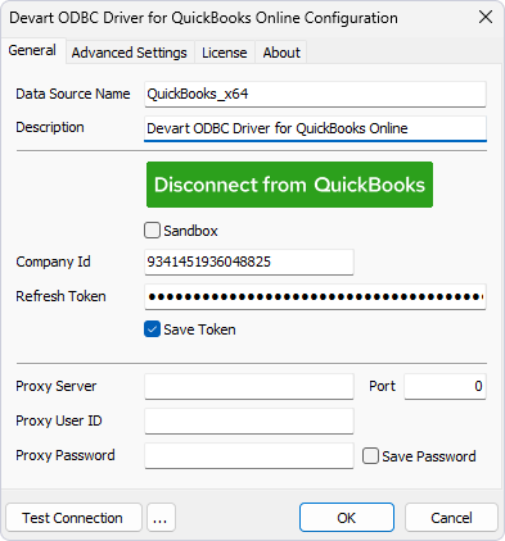 Devart uses OAuth 2.0 authentication. You authenticate through the QuickBooks browser login, approve access, and the driver securely manages access and refresh tokens. No raw usernames or passwords are stored.