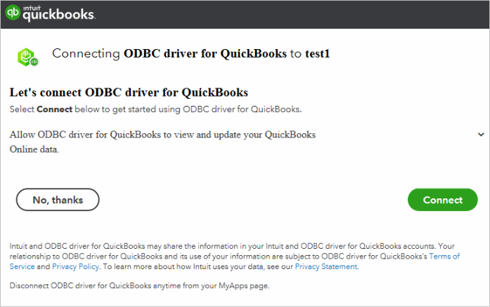 - Click Connect to QuickBooks in the Devart driver window.