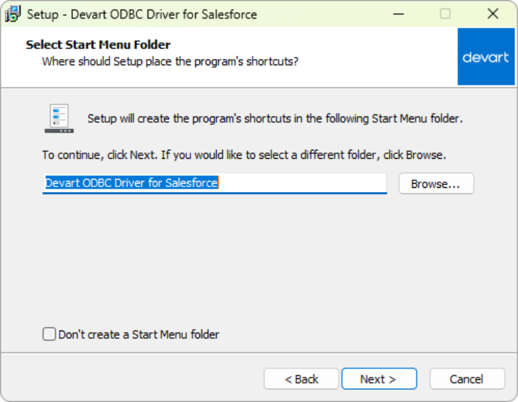 - Set Start Menu folder: Choose a folder for shortcuts, or select Don’t create a Start menu folder, then click Next.