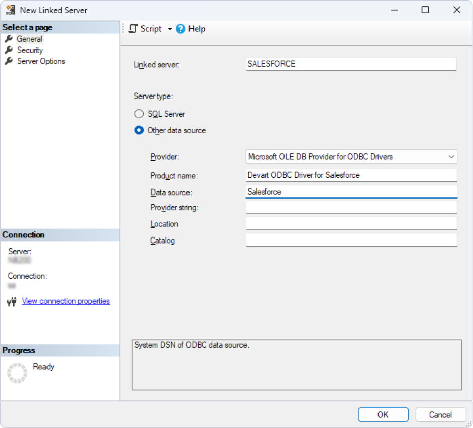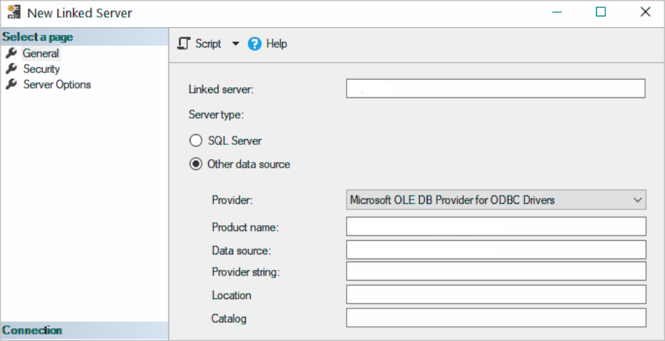 - Choose the provider: In the dialog box, set Server type to Other data source and select Microsoft OLE DB Provider for ODBC Drivers (MSDASQL).