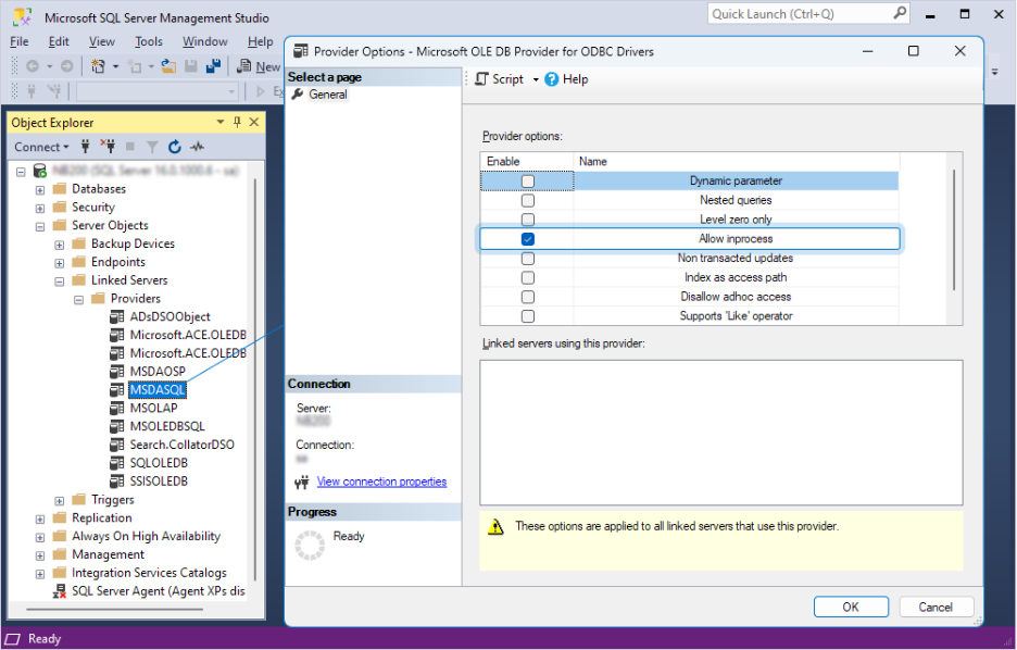 - Adjust provider settings: Under Linked Servers > Providers, double-click MSDASQL.
