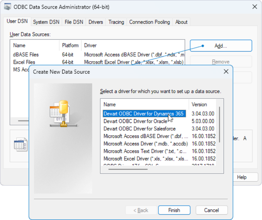 odbc.iniwith the driver path and connection details. - Select Devart driver: In the Create New Data Source dialog, choose Devart ODBC Driver for Salesforce and click Finish.